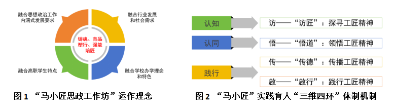 “马小匠思政工作坊”,以“四个融合”为育人基点,以“铸魂、育品、塑行、强能、培匠”为育人核心,大力推进职业教育思想政治工作,旨在打造为新时代增强高职员工工匠精神教育的重要窗口,打造成新时代加强工匠精神教育的生动范例,打造好新时代地方高职院校思想政治教育的育人品牌。该项目通过“访匠”“悟道”“传德”“啟行”,引导员工探寻工匠精神、领悟工匠精神、传播工匠精神、践行工匠精神,实现对工匠精神的“认知-认同-践行”,以此构建“访、悟、传、啟”实践育人“三维四环”体制机制。