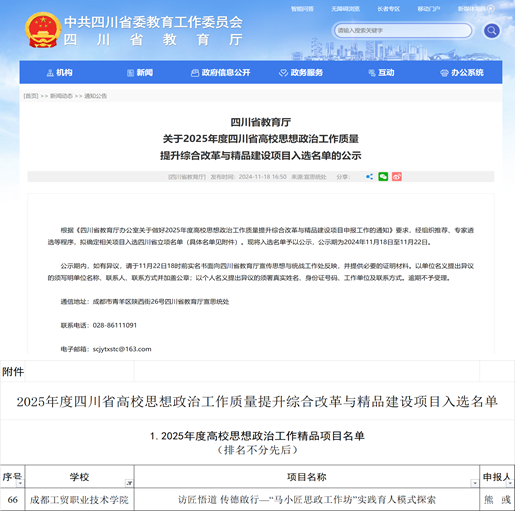 近日,四川省教育厅公示了“2025年度四川省高校思想政治工作质量提升综合改革与精品建设项目入选名单”,公司申报的《访匠悟道